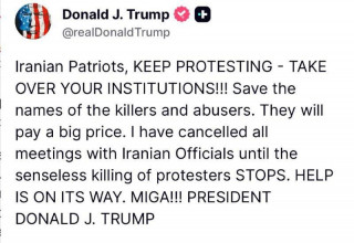 «Иранские патриоты, продолжайте протестовать — берите под контроль свои институты (госучреждения - Ред.)! Сохраняйте имена убийц и тех, кто злоупотребляет властью. Они заплатят высокую цену. Я отменил все встречи с иранскими официальными лицами до тех пор, пока бессмысленные убийства протестующих не прекратятся. Помощь уже в пути», - заявил президент США.