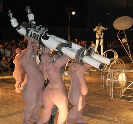 Терпения едва хватило на первые 30 минут стояния и созерцания. Это не Лем, это пошлость и глупость. На спектакль нас двинул голод. Самый обыкновенный голод по неказенным уличным зрелищам, тонким ощущениям, публике из нормальных горожан с осмысленными взглядами, умиротворенности и дружелюбию в воздухе. И вообще всему, что делает город интеллектуальным центром, населенным цивилизованными людьми этого так мало в Киеве последних лет. Рекламные ролики-анонсы уличного представления «Планета Лем» театра Biuro Podrozy, ставшего частью польской международной программы I,CULTURE, оказались в сети как нельзя вовремя, будоражили воображение и даже как будто обещали небольшую революцию под открытым небом.