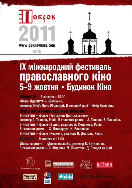 Справка. Международный фестиваль православного кино «Покров» проходит в Киеве, по благословению Предстоятеля Украинской Православной Церкви Блаженнейшего Владимира, Митрополита Киевского и Всея Украины, уже 7 лет подряд. В этом году спонсорами кинофестиваля «Покров» выступили «SMARTholding» и фонд Василия Горбаля при поддержке ТРК «Эра» и «Киевский телеграф». Организаторами IX Международного фестиваля православного кино «Покров» вытупают Синодальный отдел УПЦ по делам молодежи, Агентство социальных проектов «Покров», духовный руководитель – настоятель Ионинского монастыря епископ Обуховский Иона.
