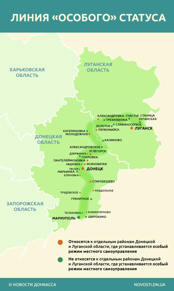 Согласно же закону о местном самоуправлении в Донецкой и Луганской областях, изменения в который были приняты Радой 17 марта, кастинг на получение «особого порядка» прошли только те районы Донбасса, которые соответствуют одновременно двум критериям: подконтрольны боевикам и при этом расположены на линии разграничения, утвержденной Минскими договоренностями.