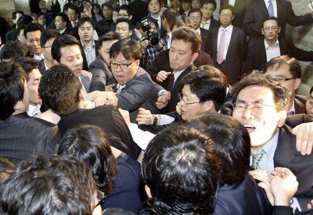 Члены правящей партии Южной Кореи дерутся с представителями оппозиционной партии в Сеуле 6 декабря 2004 года.