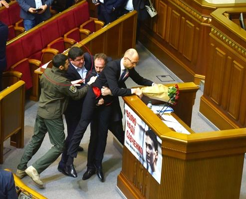 К трибуне сразу же подбежали нардепы от БПП и «Народного фронта» и начали жесткую потасовку. Яценюк же прокомментировал драку словами: «Ничего страшного, дебилов много».