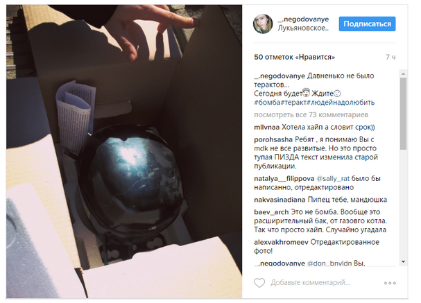 «Давненько не было терактов...Сегодня будет. Ждите.#бомба#теракт#людейнадолюбить», — подписала Катя свое фото, которое она выложила примерно за 6 часов до взрыва. Фото активно постили в новостных пабликах России, сообщая, что во взрыве, повторим, найден украинский след.