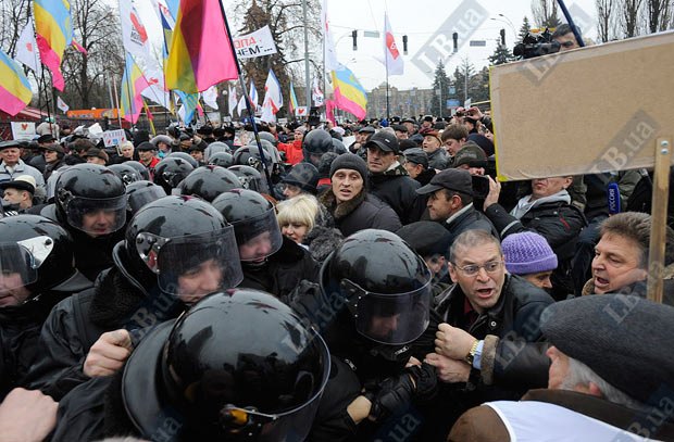 Возле здания Апелляционного суда сотрудники спецподразделения «Беркут» выталкивают сторонников экс-премьера Юлии Тимошенко на проезжую часть, под колеса проезжающих автомобилей. Об этом 13 декабря сообщила глава луганской организации партии «Батькивщина» Ирина Веригина, которая участвует в митинге у здания суда.