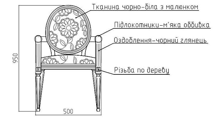 Согласно конкурсной документации, изображенные на картинке стулья должны быть изготовлены из массива бука с элементами резьбы. Цвет отделки черный глянец. Ткань обивки черная с белым рисунком в виде цветов, материал шенилл (состав: 8%-вискоза, 43% полиэстер, 49% полиакрил).