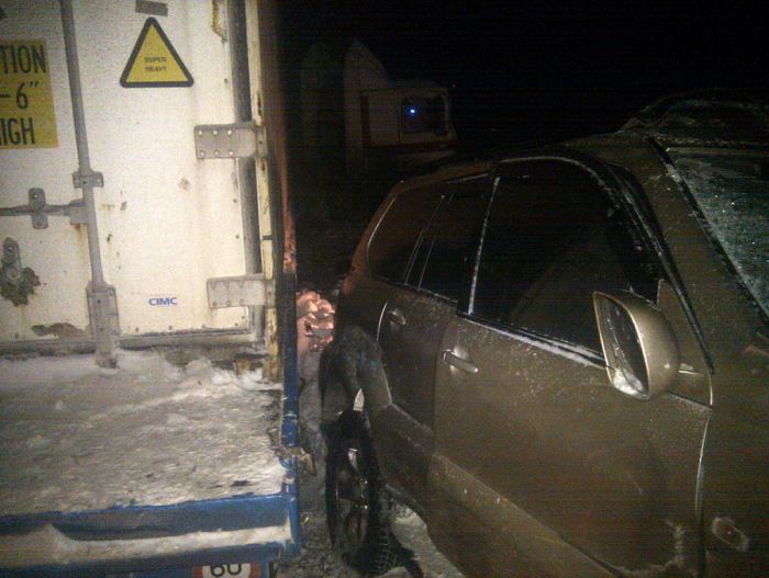 В субботу, 24 декабря, на трассе между Мариуполем и Бердянском, на 617 км автодороги Одесса Мелитополь Новоазовск произошло ДТП. Здесь столкнулись внедорожник Toyota Land Cruiser Prado и тягач MAN полуприцеп с контейнером.