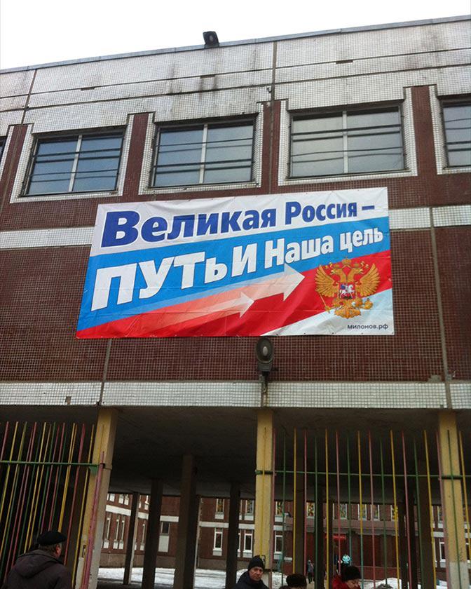 Россия, Санкт-Петербург, улица Маршала Казакова. Вход в школу, где располагаются избирательные участки №№ 550, 548, 549, украшен вот таким плакатом. Такие плакаты висят на каждом избирательном участке Кировского района Санкт-Петербурга.