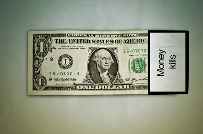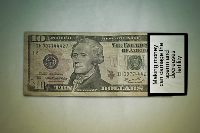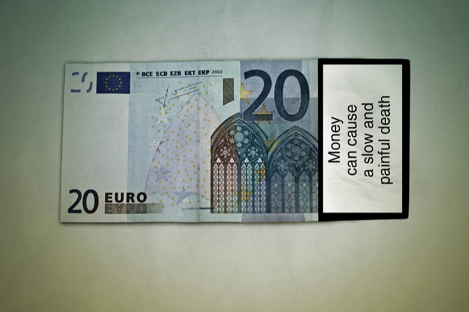 Деньги, деньги, деньги. Они повсюду. Товары, музыка, кино, фотография, все имеет свою цену. Итальянский художник, фотограф и режиссер Риккардо Питталуга решил, что на деньги, как и на пачки сигарет, нужно клеить предупреждения об их чрезвычайной опасности и создал серию работ под названием «Осторожно: деньги» («Warning: money»).