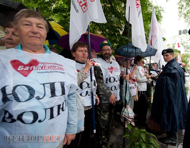 Участники акции стоят под флагами объединенной оппозиции. Они одеты в футболки с надписями «Свободу Юле!» на украинском и английском языках, передает Цензор.НЕТ.