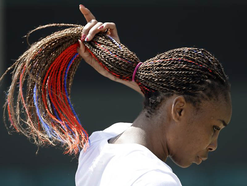 Венера Уильямс, Соединенные Штаты Америки, теннис, подобрала в хвост свои волосы с вплетенными в них красными и голубыми нитями.