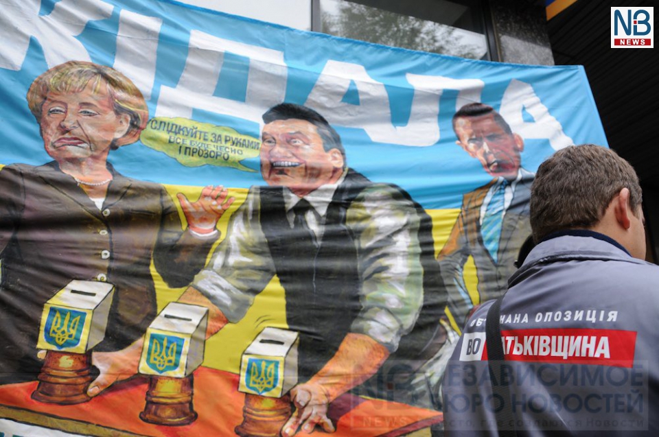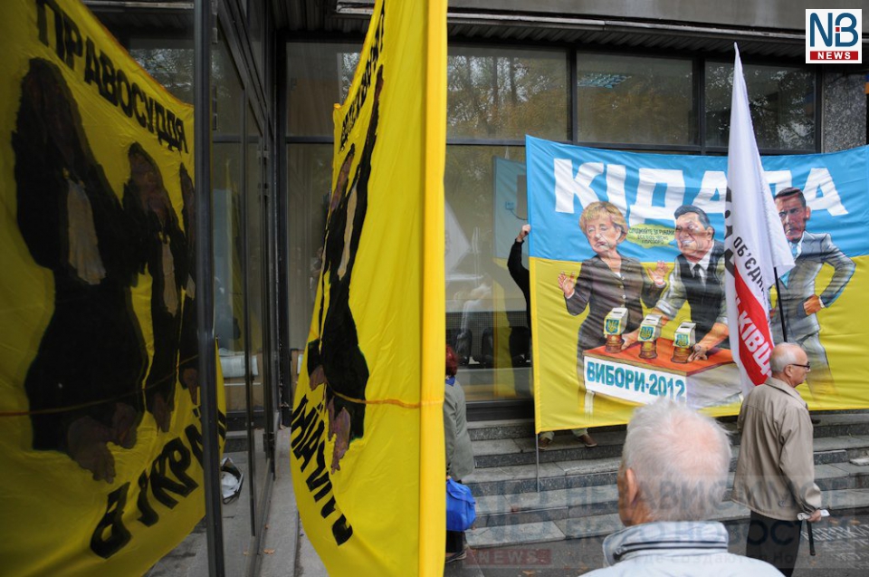 Около сотни представителей Объединенной оппозиции «Батькивщина» пикетируют Киевский апелляционный административный суд, в котором рассматривается иск по нарушениям в процессе подготовки к жеребьевке в окружных избирательных комиссиях.