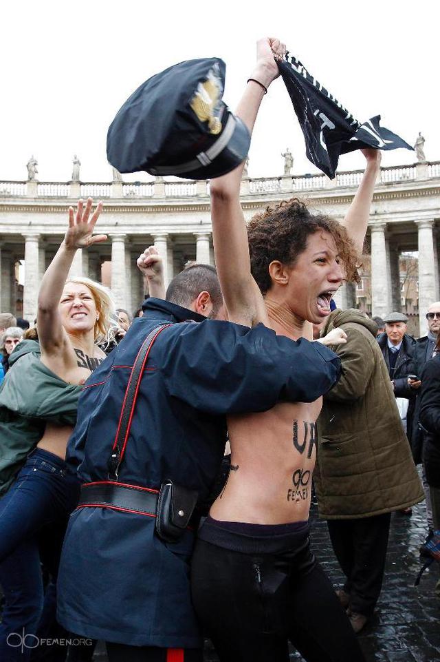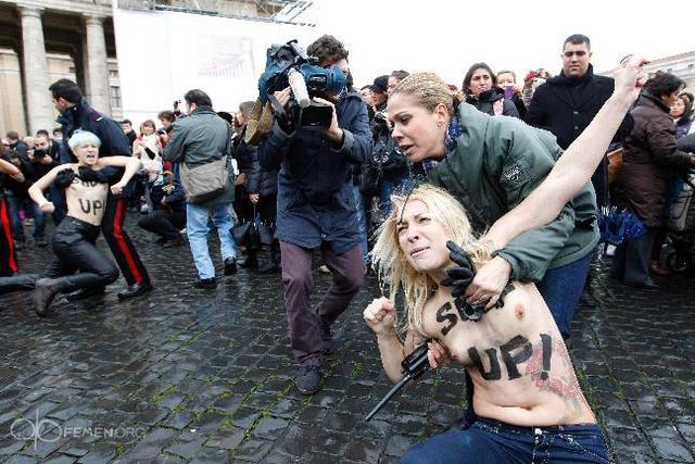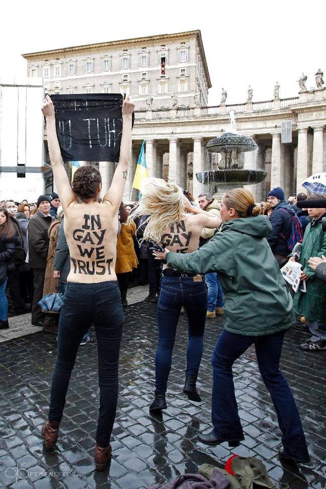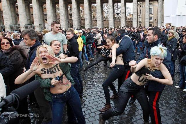 Ранее «Фраза» сообщала, что участницы движения Femen 13 января провели акцию во время воскресной мессы Папы Римского в Ватикане. Четыре девушки разделись на площади перед собором Святого Петра в Риме в тот момент, когда на балкон вышел Бенедикт XVI. При этом они кричали «Shut up!». На телах активисток были надписи «In gay we trust!», поскольку данная акция протеста была направлена в поддержку однополых браков.