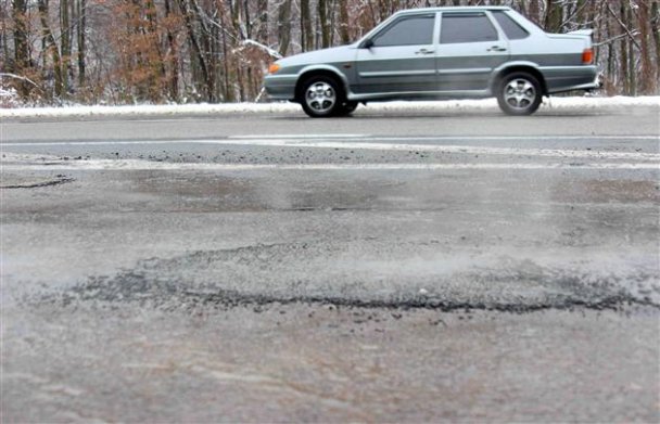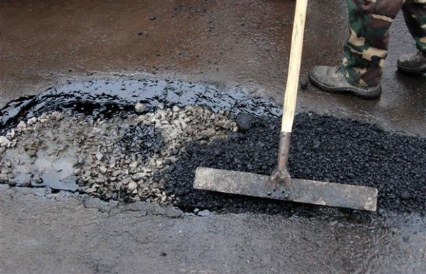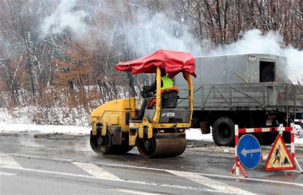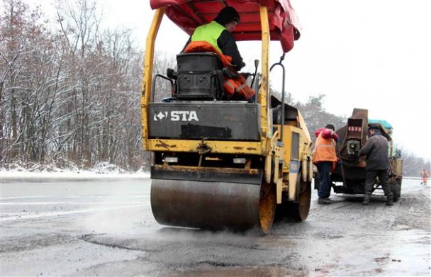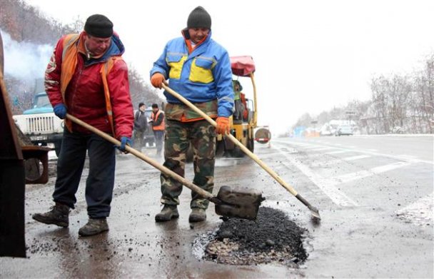 Отрезок международной трассы Киев-Чоп взялись ремонтировать. Ямы засыпают щебнем, а сверху кладут тонкий слой асфальта, несмотря на то, что в них еще стоит вода.