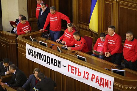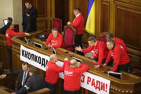 Депутаты от оппозиции продолжают блокировать трибуну и президиум Верховной Рады.