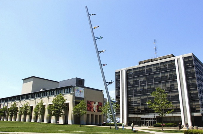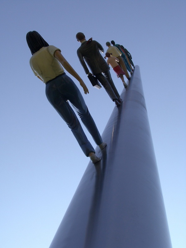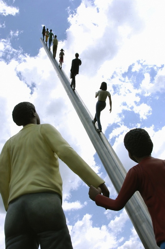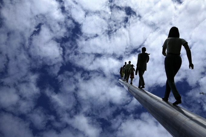 Инсталляция представляет собой 10 скульптур людей в натуральную величину, идущих по трубе, 30 метров высотой, наперекор законам физики, сообщает Etoday.