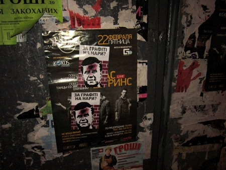 В Черновцах появились наклейки, на которых изображен человек, похожий на президента Виктора Януковича, с характерным красным пятном на лбу, которое напоминает след от пули.