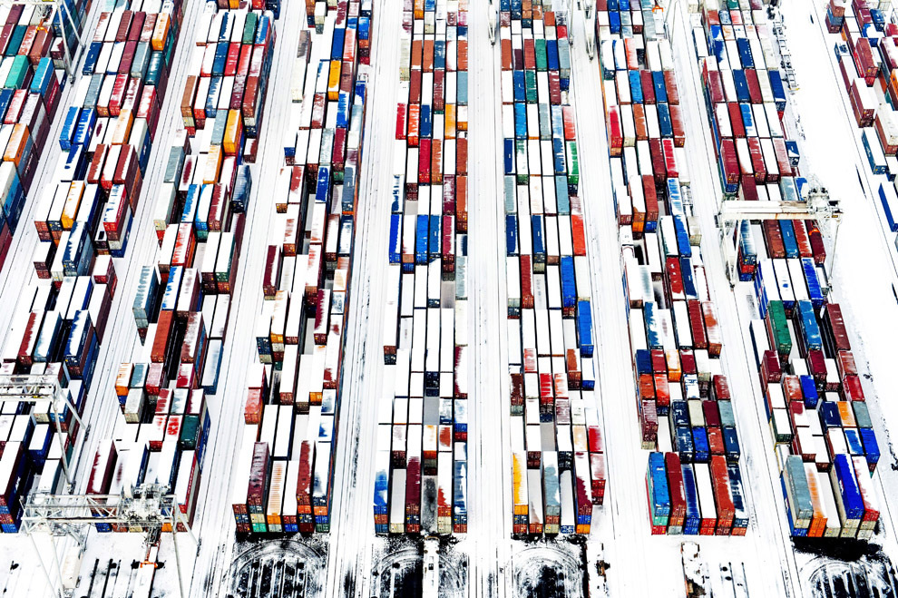 Заснеженные контейнеры в порту в Роттердаме, Нидерланды
