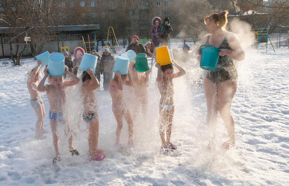 Дети обливаются холодной водой под присмотром воспитательницы Маргариты Филимоновой в детском саду в Красноярске, Россия