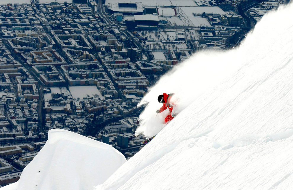 Шведский фрирайдер Йон Эрарбек спускается по склону горы Зеегрубе в Инсбруке, Австрия