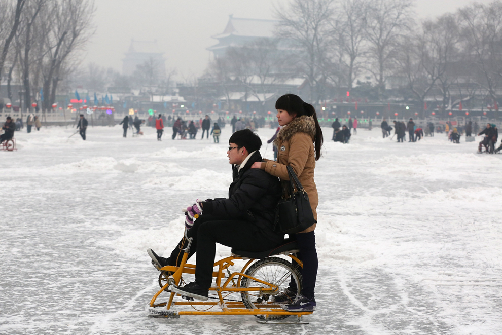 Катание на ледовом велосипеде на замёрзшем озере Хоухай в Пекине, Китай