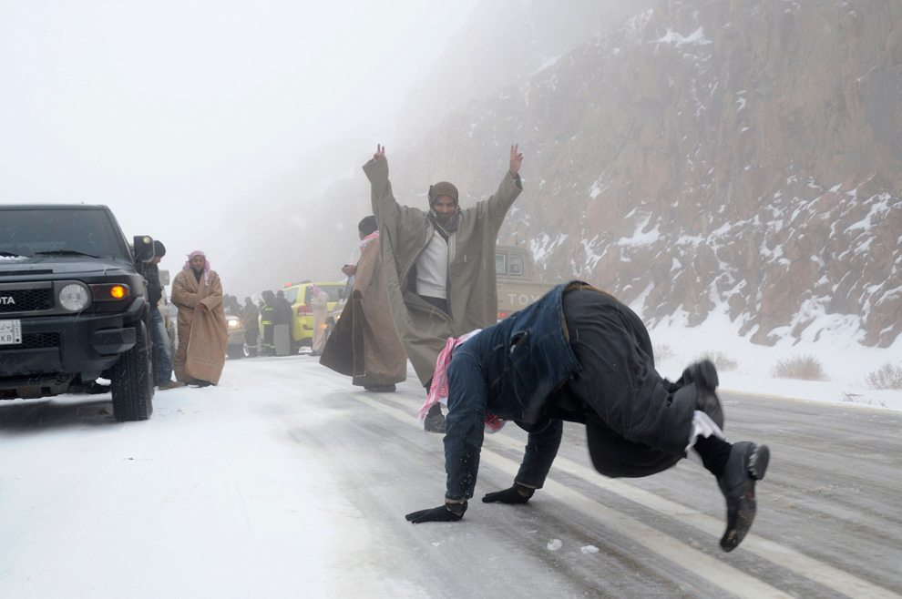 Люди веселятся после сильного снегопада в пустыне недалеко от Табука, Саудовская Аравия