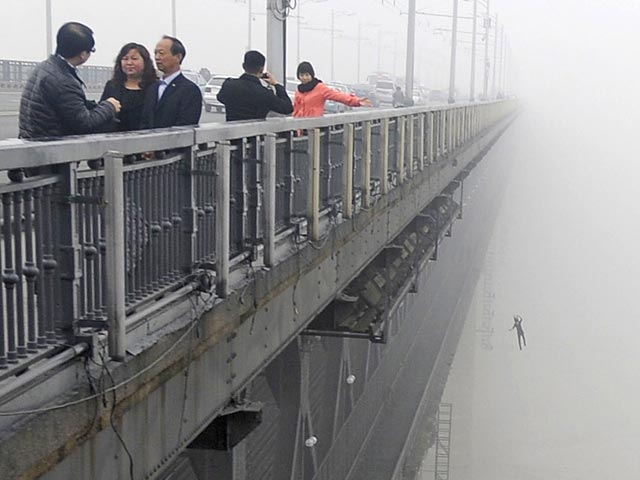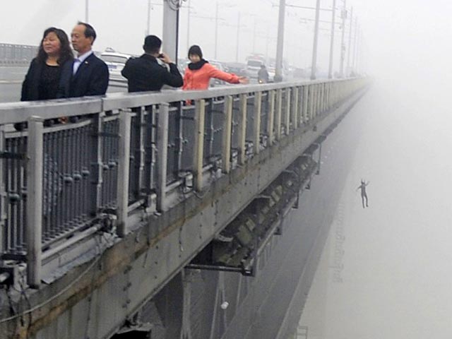 Увлекшись туманом в Ухане, журналист не заметил, что в некотором отдалении от него, прямо по курсу съемки какой-то человек перелезает через перила и прыгает вниз. Только мгновение спустя фотограф услышал, как кто-то закричал.