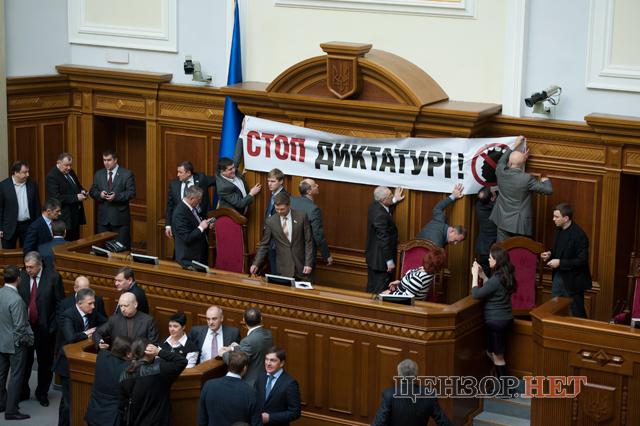 Над рабочим местом спикера депутаты повесили плакат с надписью: «Стоп диктатуре!».