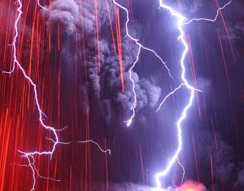 В то время как вулкан Сакурадзима извергался, в него ударила молния.