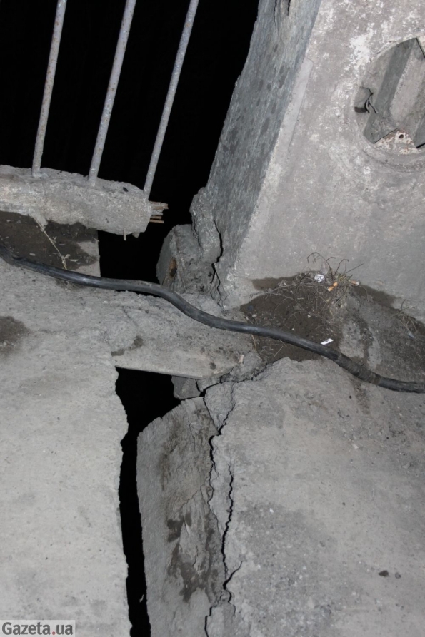 На мосту горит несколько фонарей. За десяток метров прямо на полотне моста стоит три железобетонных блока, которые огораживают провал. Через железную арматуру видно воду. Неподалеку на пешеходном тротуаре разошлись плиты, образовав расщелину в полметра шириной. На середине стоит грузовик, работают рабочие. У них горит фонарь. Большая часть моста не освещена.