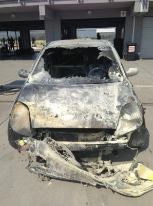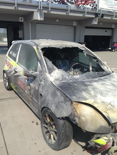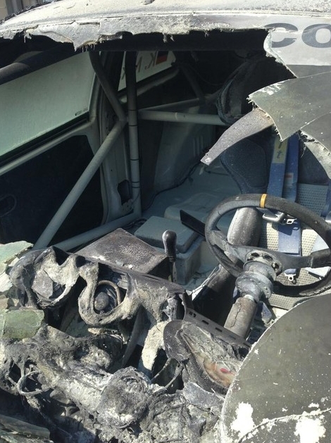 «Ветром пламя перебросило в салон. Руль отстегнуть было уже невозможно. Не могу объяснить, как я вылезла в шлеме из-под руля, через защитную сетку сбоку», вспоминает Ксения, машина которой сгорела дотла и ремонту не подлежит.