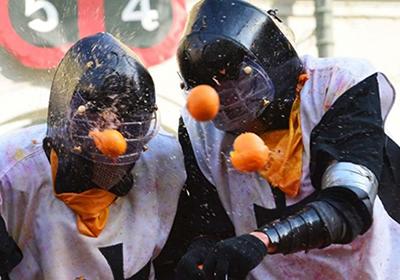 Участники крупнейшей продовольственной битвы в Италии, проводимой ежегодно, в обязательном порядке одевают защитные шлемы. Мероприятие, как полагают, имеет средневековое происхождение. Но истинные его корни забыты во времени.