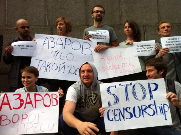 Журналисты держат в руках плакаты «Азаров, чьо такой дерзкий?», а также призыв к журналистам «Действуйте!», сообщает «Украинская правда».