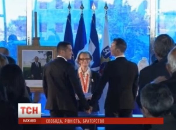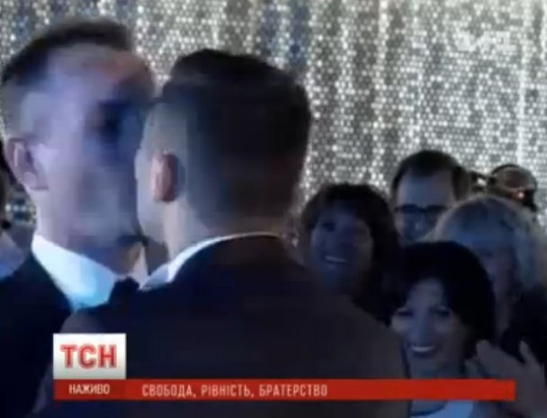Молодожены вышли на церемонию под мелодию песни «Love». Оба были в классических костюмах: один с галстуком, другой с бабочкой. Они держались за руки, а гости стоя приветствовали их аплодисментами. Вопрос молодоженам: «Согласен?» по очереди задавала лично мэр города. Далее молодожены целовали друг друга, целовали мэра и победно показывали свидетельство о браке.