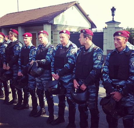 Около 40 сотрудников Беркута заблокировали журналистов возле центрального въезда в резиденцию «Межгорье». Они не объясняют своих действий, отталкивая представителей прессы.