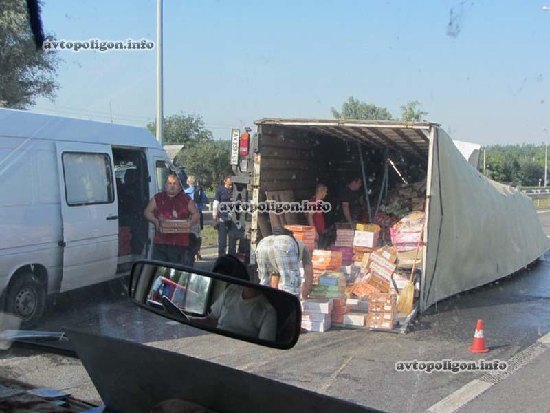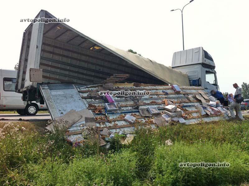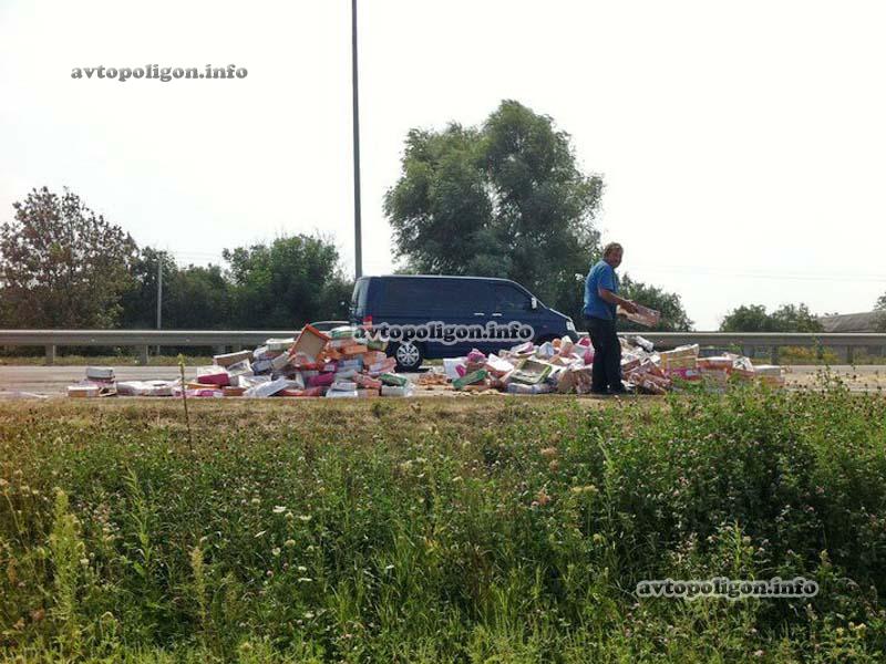 Утром 11 августа недалеко от Житомира произошло ДТП, в результате которого перевернулась фура, перевозившая коробки с печеньем.