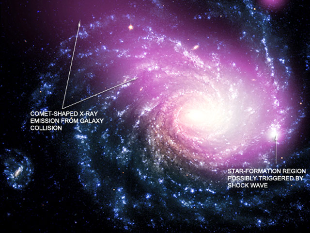 Ученые скомбинировали оптическое и рентгеновское изображение и увидели, что спиральная галактика NGC 1232 поглощает маленькую галактику, увеличиваясь в размерах. В голове «кометы» также было обнаружено несколько ярких звезд, которые, возможно, образовались в результате ударной волны.