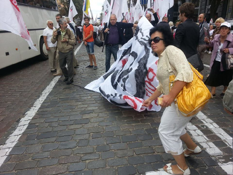 На акции оппозиции ко Дню независимости был развернут большой баннер с «простреленным» президентом Виктором Януковичем. Как сообщает пресс-служба «Черного комитета», граждане символически пронесли баннер под зданием СБУ, но практически сразу на активистов набросилась милиция.