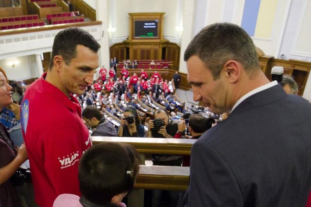 Лидер партии «УДАР» Виталий Кличко привел брата-боксера Владимира на экскурсию в Верховную Раду Украины.