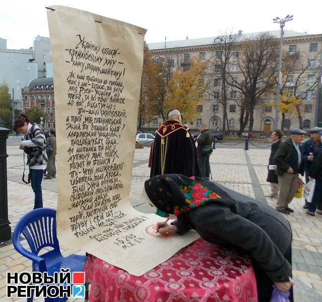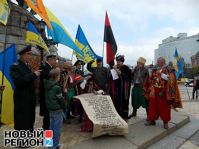 В воскресенье, 13 октября, активисты Конгресса украинских националистов провели в Киеве у памятника Богдану Хмельницкого перфоманс — по примеру казаков написали письмо «Кремлёвскому хану — шайтану» с протестом против идеи вступления Украины в Таможенный союз. В понедельник, 14 октября, документ будет передан в посольство.