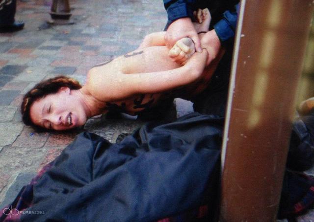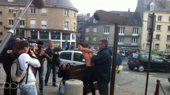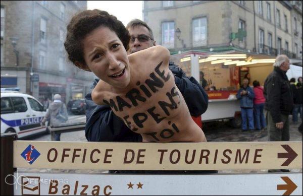 Активистки движения FEMEN устроили акцию протеста во время выступления лидера французских националистов и партии «Национальный фронт» Марин Ле Пен. Когда Ле Пен выступала две активистки выбежали из толпы с криками «Марин, покайся» и «Секстремизм вместо фашизм».