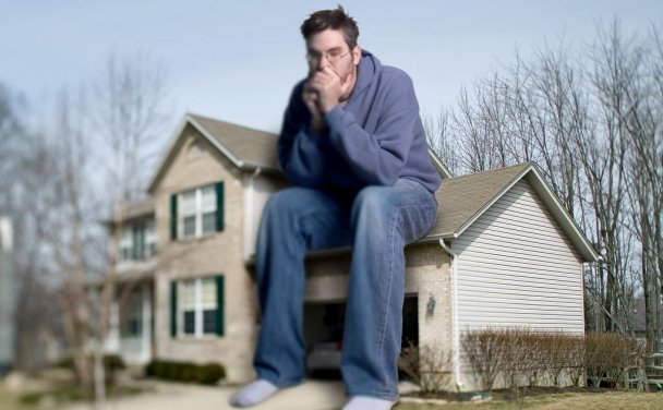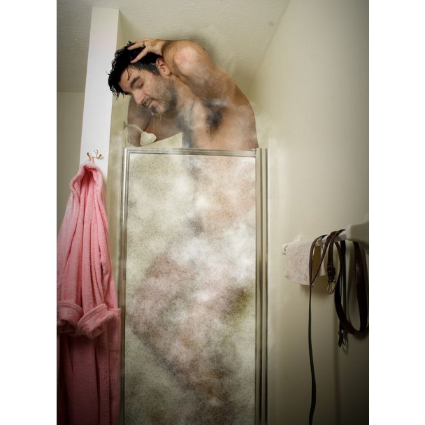 На фото Полу приходится мыться в тесной душевой кабине, ходить по дому сгорбленным, или и вовсе сидеть на крыше, будто дом игрушечный.