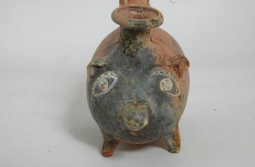 Сосуд имел внизу терракотовые погремушки, которые могли служить для успокаивания ребенка. Предмет – один из нескольких артефактов, обнаруженных в мае этого года в захоронении в местечке Мандурия недалеко от города Таранто. Гробница, прорубленная в скале, имела размер 2,4х1,2 м. В ней были похоронены два человека, которые, скорее всего, были членами одной семьи. В ходе исследования было найдено около 30 предметов, в том числе кувшины, тарелки, лампады, вазы, три сосуда для кормления ребенка и две терракотовые женские фигурки. Найденный в захоронении железный нож указывал на то, что здесь был похоронен мужчина.