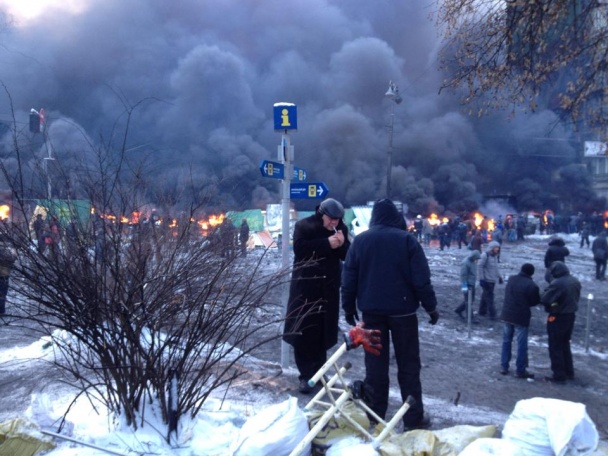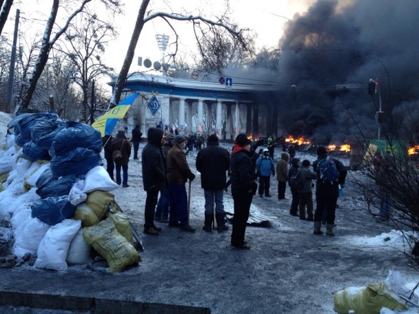 На территории собрались около 300 активистов. Они охраняют баррикады и изредка бросают камни в сторону силовиков. В ответ им летят светошумовые и газовые гранаты.