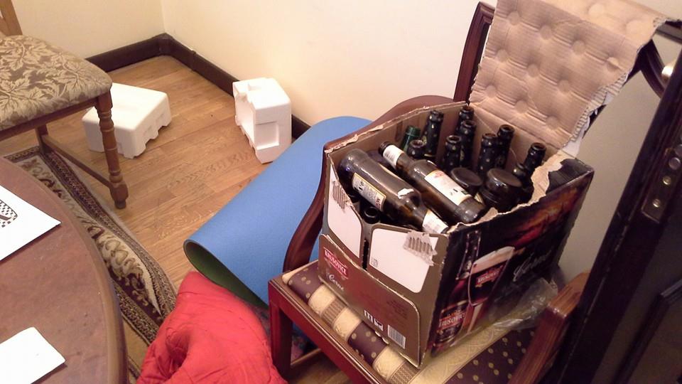 Находящиеся в Киевсовете милиционеры рассказали, что нашли на шестом этаже алкоголь. Кроме того, в кабинете замглавы КГГА Виктора Коржа нашли ящик с бутылками из под пива и бутылку из под вина. Кроме того в приемных стояли бутылки из под виски и вина.