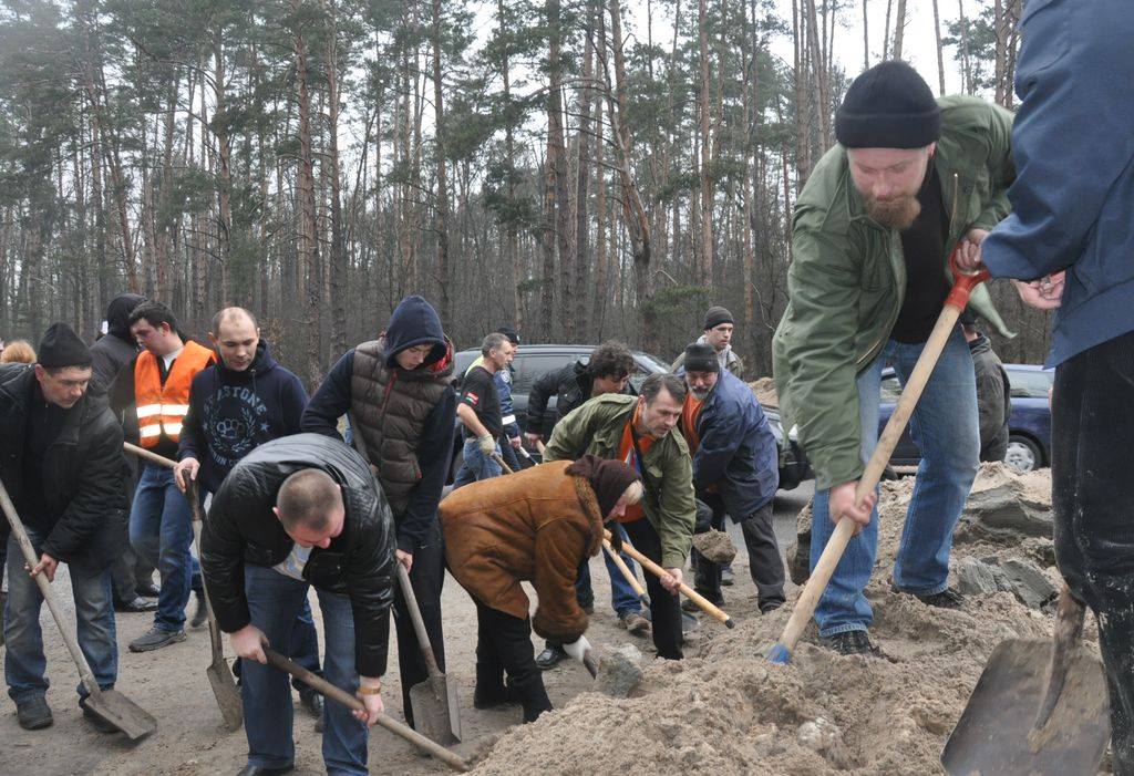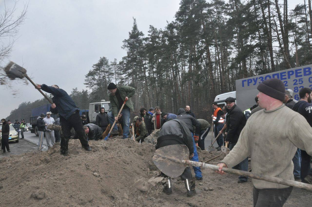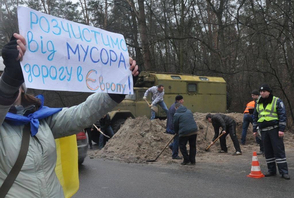 Под Киевом активисты провели акцию «расчистим от мусора дорогу в Европу», убрав с Варшавской трассы песок и оттянув с проезжей части грузовик для нормального проезда автомобилей.