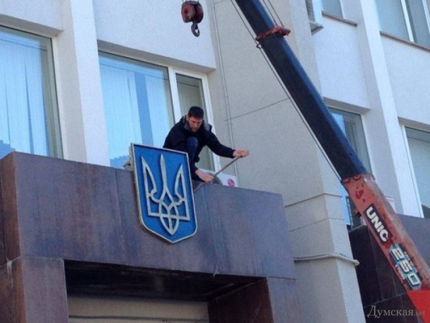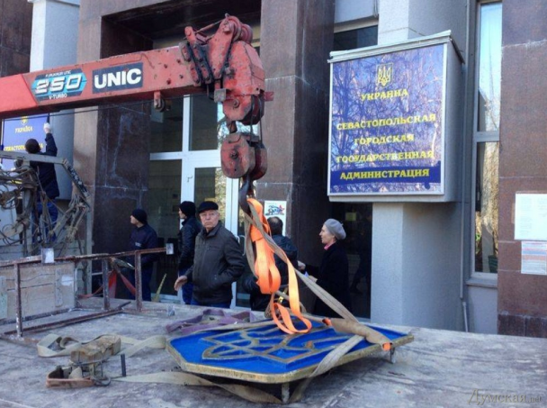 В Севастополе демонтируют государственные символы Украины с административных зданий. На месте работает кран, который снимает, в частности, тризуб с помещения Севастопольской городской государственной администрации.
