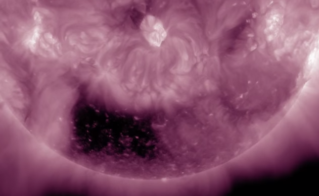 Аппарат NASA Solar Dynamics Observatory запечатлел на Солнце корональную дыру необычной квадратной формы. Снимки в рентгеновском диапазоне были получены 5-7 мая этого года. Корональные дыры представляют собой «прорехи» в магнитном поле, позволяющие плазме, обычно удерживаемой в околосолнечных областях, устремляться прочь от Солнца. В зависимости от направления потока плазмы солнечный ветер может воздействовать на магнитное поле Земли, вызывая полярные сияния. Квадратная корональная дыра, наблюдаемая SDO, не вызовет какие-либо явления на нашей планете, поскольку дыра находилась ближе к южному полюсу.