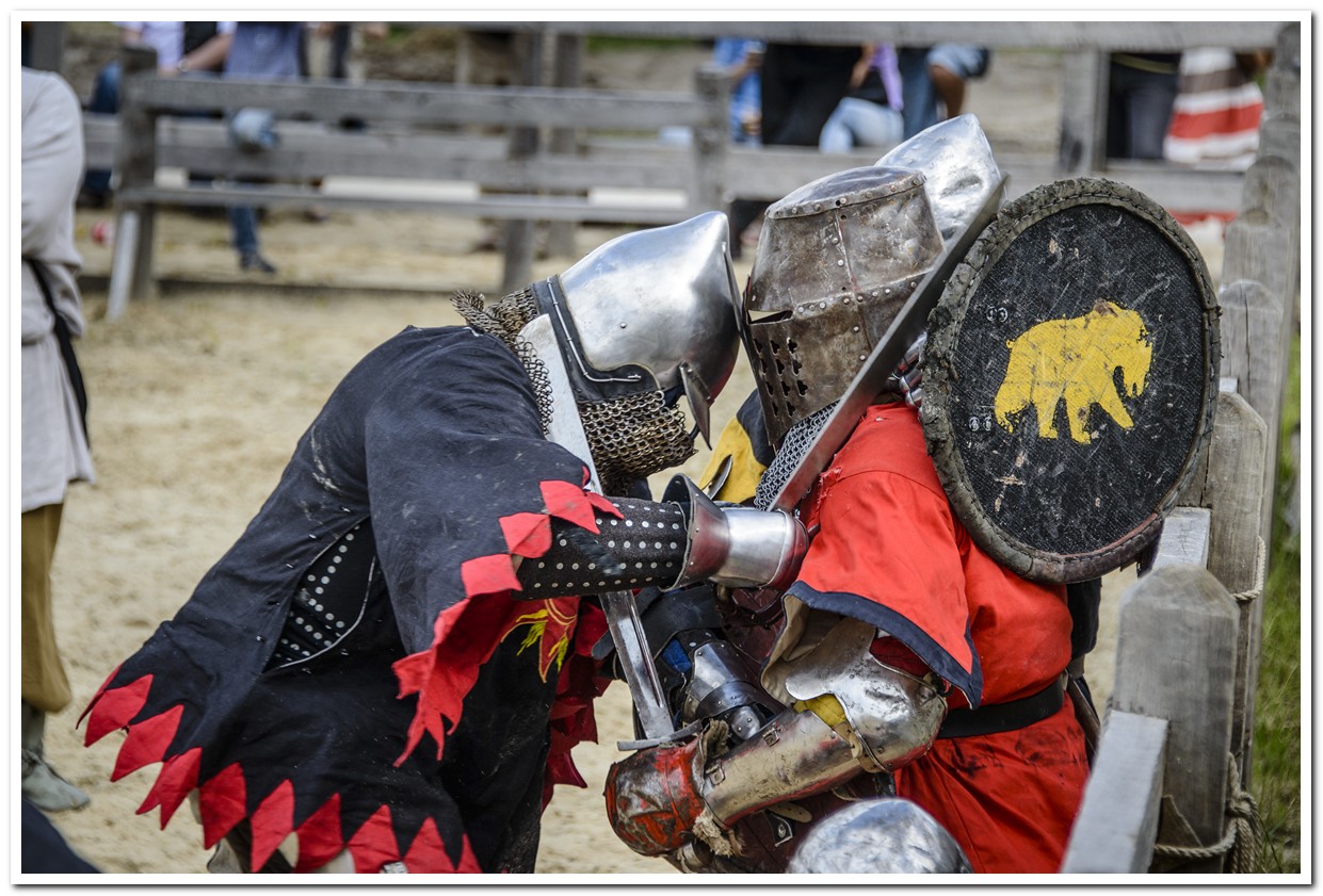 Началось действо с массового боя „стенка на стенку“. Как много сотен лет назад рыцари в тяжелых доспехах сошлись в ожесточенном поединке. Во время битвы было применено древнюю метательное оружие — требуше. В древности именно такие машины использовались для штурма городов.