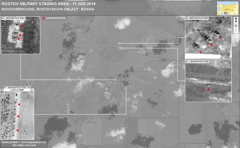 Изображение от 11 июня 2014 года. На нем видны 10 танков, три из которых находятся на транспортерах — основной способ перемещения танков по дороге.