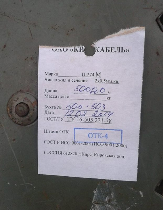 На мотках и катушках с кабелями были обнаружены бирки, свидетельствующие о том, что эта продукция была произведена в России в 2014 году.